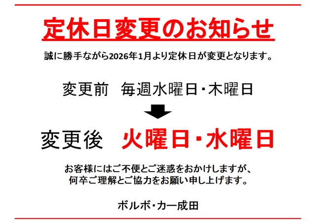 【 お知らせ 】ー 定休日変更のお知らせ ー